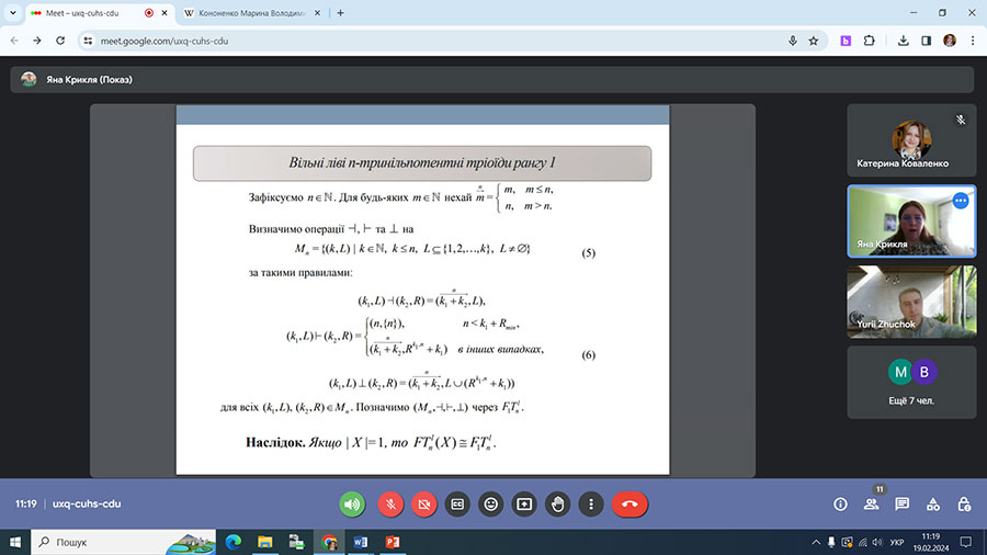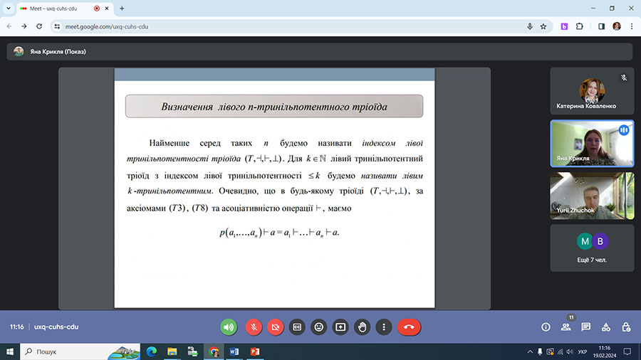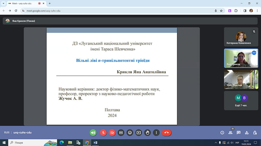 До розгляду і проведення захисту було представлено дисертацію на здобуття ступеня доктора філософії за спеціальністю 111 «Математика» Криклі Яни Анатоліївни на тему: «Вільні ліві n-тринільпотентні тріоїди».