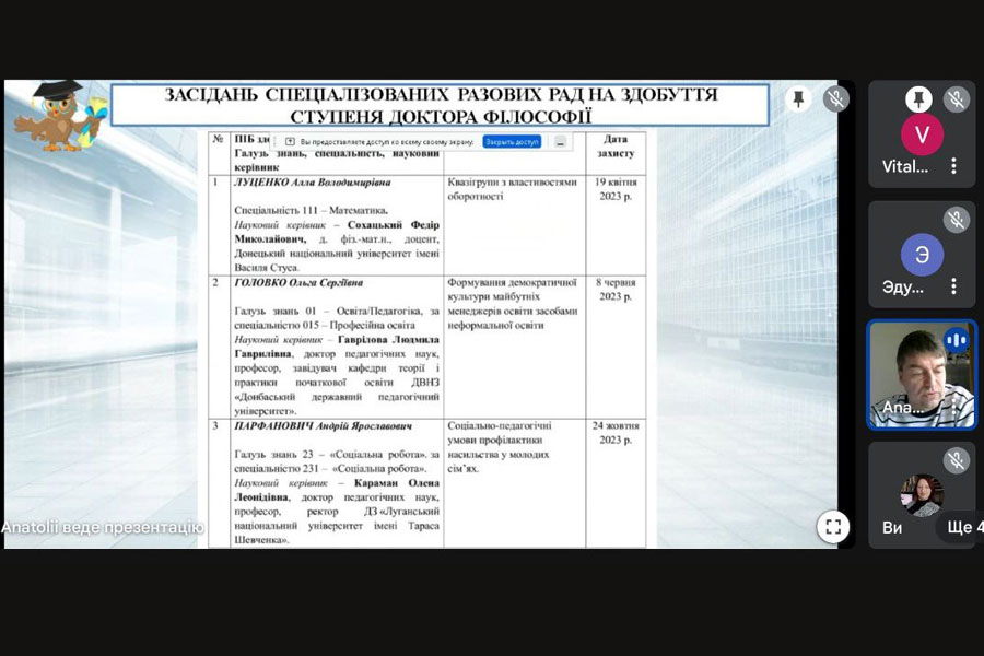 По другому питанню про роботу спеціалізованих вчених рад було заслухано та обговорено доповідь проректора з науково-педагогічної роботи Анатолія Жучка. Вчена рада відзначила, що у ДЗ «ЛНУ імені Тараса Шевченка» на сьогодні функціонують дві спеціалізовані вчені ради з правом приймати до розгляду та проводити захисти докторських (кандидатських) дисертацій за спеціальностями: 13.00.01 – загальна педагогіка та історія педагогіки, 13.00.06 – теорія та методика управління освітою, 13.00.04 – теорія і методика професійної освіти, 13.00.05 – соціальна педагогіка. Головою спеціалізованої ради Д 29.053.01 є доктор педагогічних наук, професор Олена Караман, головою ради Д 29.053.03 – доктор педагогічних наук, професор Ірина Цебрій. Протягом 2023 року в цих радах було захищено три докторські дисертації. Крім того, у 2023–2024 навчальному році відбулось 7 засідань спеціалізованих разових рад на здобуття ступеня доктора філософії. Здобувачі успішно захистили дисертації згідно процедури нового Порядку присудження ступеня доктора філософії та скасування рішення разової спеціалізованої вченої ради закладу вищої освіти, наукової установи про присудження ступеня доктора філософії та отримали дипломи докторів філософії.