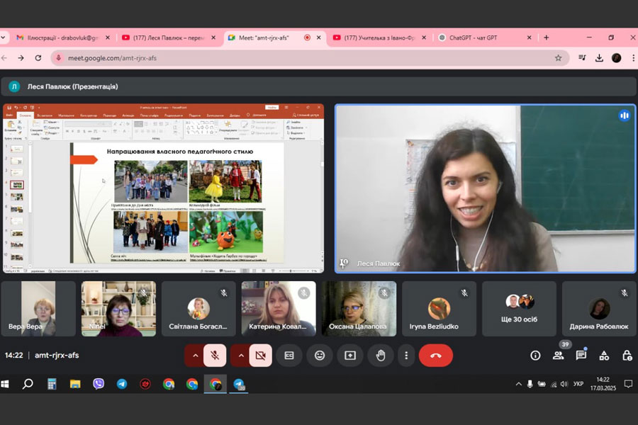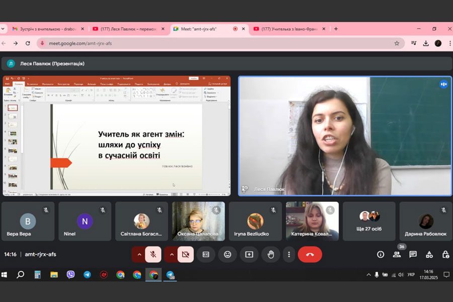 17.03.25 в навчально-науковому інституті педагогіки і психології ДЗ «Луганський національний університет імені Тараса Шевченка» за ініціативи кафедри початкової освіти відбулася онлайнова зустріч з Лесею Іванівною Павлюк — переможницею національної премії Global Teacher Prize Ukraine 2024, вчителькою початкових класів ліцею № 7 м. Івано-Франківськ.
