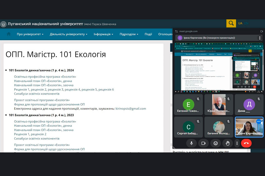Гарант освітньої програми «Екологія» Ірина КИРПИЧОВА, кандидат біологічних наук, доцент, зустрілася зі здобувачами вищої освіти, які вступили цього року до ДЗ «Луганський національний університет імені Тараса Шевченка» на освітньо-професійну програму магістерського рівня.