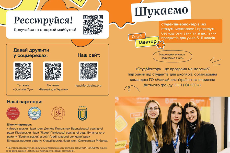 «СтудМентор» — це програма для українських студентів, які готові підтримати школярів з прифронтових регіонів та показати їм, що навчання — це класно. Все це — через підхід академічного менторингу, де студенти (ментори) передають знання та досвід школярам (менті).