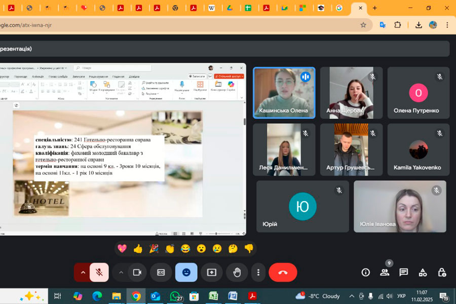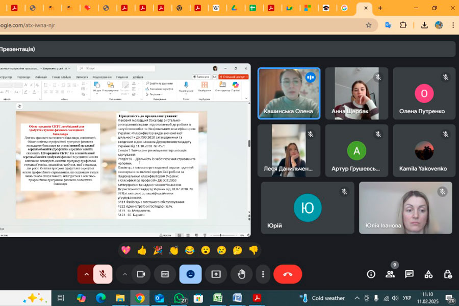 11 лютого 2025 року члени робочої групи освітньої-професійної програми «Готельно-ресторанна справа» ВСП «Фаховий коледж ДЗ «ЛНУ імені Тараса Шевченка» (Іванова Юлія, викладач вищої кваліфікаційної категорії; Кашинська Олена, кандидата педагогічних наук»; Путренко Олена, викладач другої кваліфікаційної категорії; Данильченко Леся, здобувачка фахової передвищої освіти, 2 курс, спеціальність «Готельно-ресторанна справа»; Щербак Анна, здобувач фахової передвищої освіти, 2 курс, спеціальність «Готельно-ресторанна справа») зустрілися зі стейкхолдерами, серед яких: